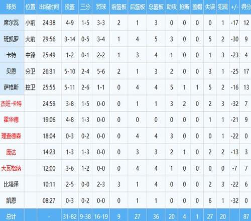 特别魔术的当家球星班凯罗在猛龙围剿下发挥拉到不能再拉了,出手14次仅中3球得到9分5板3助同时出现5次失误,正负值-30全场第二低。