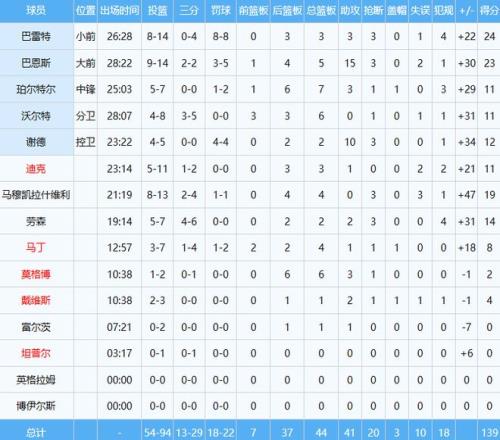 魔术只有三人得分上双,且没有一人得分接近20分。